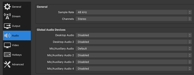 Next, we want to set up OBS / SLOBS (both work in the same manner). Open Settings and go to Audio and you should see something like the following: