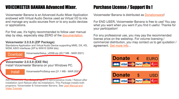 Scroll down a little until you reach the Install button which you can also see circled in red in the picture below. This will download a small 20MB .exe file which contains the full Voicemeeter package along with Voicemeeter Banana.