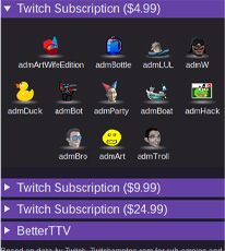 Emotes Showcase is a nifty panel extension that shows off your subscriber emotes, follower emotes, Bit reward badges, cheermotes, and any popular BTTV and FFZ emotes available on your channel.