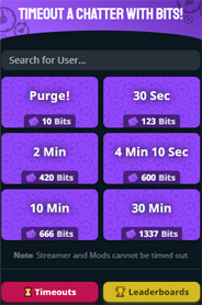 Timeout With Bits is a fun little panel extension that lets users in chat time each other out using Bits. The more Bits a user spends, the longer the timeout.
