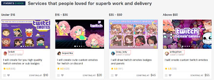 Here, you can purchase bespoke emotes as cheap as $10 each, although prices can go all the way up to $60 each. One of the best things about Fiverr is the fact that you can see reviews for the providers on this platform.