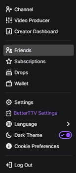 1. Click on your avatar on the top right corner of your Twitch page and select “Friends”