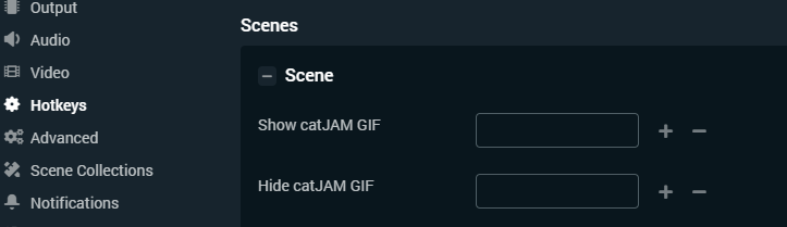3. Scroll down to find the scene that has your GIF, and click the plus icon to expand the hotkeys available.