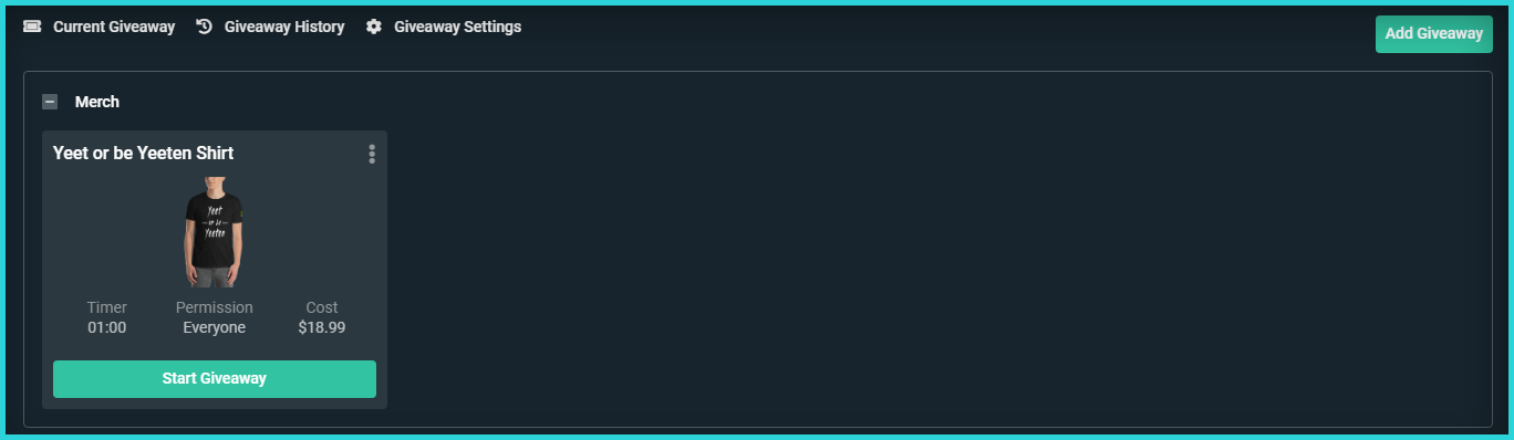 Streamlabs has its own giveaway system, which allows you to pay for any of your merchandise that you may have created, and takes care of all the rest so no details are shared between the winner and the streamer. This is a great way to show that you want to give back.