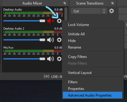 7. Go back to OBS and click on the cog wheel of any of the audio sources in the Audio Mixer and select Advanced Audio Properties.