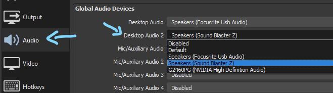 1. Go to your OBS audio settings (File > Settings > Audio) and under Global Audio Devices, for Desktop Audio 2 select a device other than the device you’re using in the main Desktop Audio, then hit Apply to save your changes.