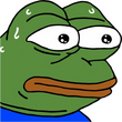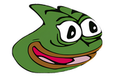 Yet another emote featuring the infamous and politicized cartoon frog Pepe. On this one, Pepe is seen with a distorted smiling face, with weird protrusions that look like horns.