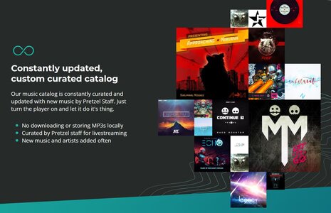 Pretzel provides DMCA-safe music for Twitch streams and VODs. It features a robust music catalog that is regularly updated by Pretzel staff.